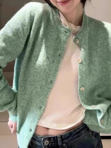 法式气质薄荷绿卷边针织开衫毛衣外套女春秋软糯绿色上衣早秋外搭