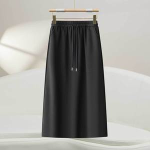半身裙女春秋季简约高腰休闲带吊绳空气棉长裙开叉直筒a字裙子