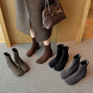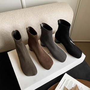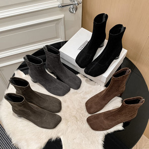 绒面弹力靴女瘦瘦靴秋冬新款粗中跟靴后拉链方头弹力短靴女单靴子