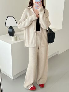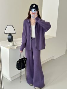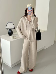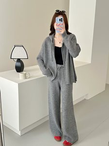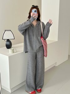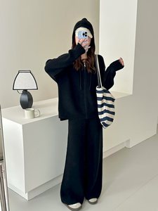欧洲站秋季新款慵懒风连帽毛衣开衫套装设计感拉链针织两件套女装