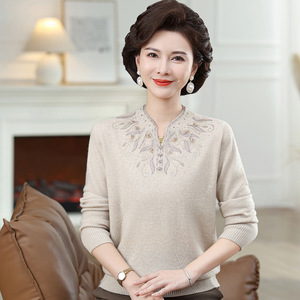 妈妈洋气100%纯羊毛打底衫中年女装秋装本命年红色上衣中老年毛衣