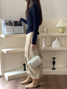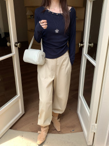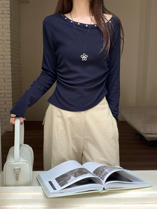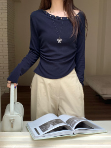 斜肩藏蓝长袖t恤女秋季新款设计感露肩修身打底衫百搭休闲上衣