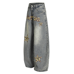2025新款美式复古潮豹纹图案字母印花阔腿直筒夏男女个性牛仔长裤