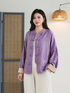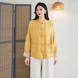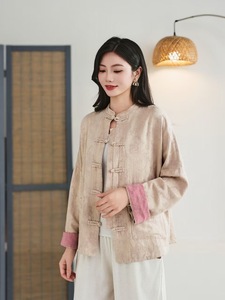 2025秋季新款立领复古盘扣暗纹提花大口袋新中式文艺范复古上衣女