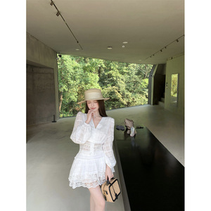 白月光白色长袖蕾丝气质小众显瘦拼接短裙套装女