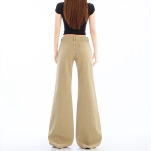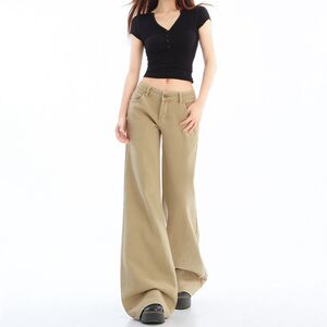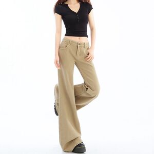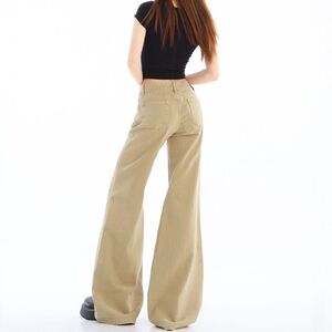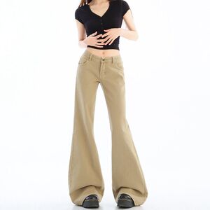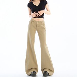 卡其色微喇牛仔裤女春秋百搭美式复古高腰不贴腿拖地直筒喇叭裤子