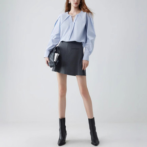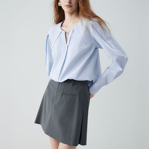 ELLE同款 蓝色v领短衬衫女2025秋新款极简通勤风休闲衬衣