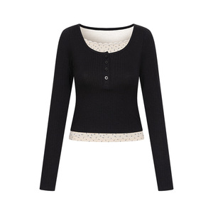 H822纯欲风蕾丝假两件u领长袖t恤女春秋法式修身内搭甜辣妹上衣女