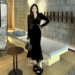 法式气质v领蕾丝拼接丝绒连衣裙女春秋高级感收腰显瘦鱼尾长裙子