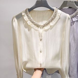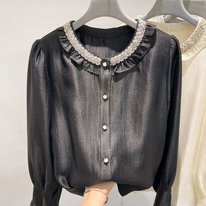 2025新款韩国气质圆领亮片钉珠边单排扣长袖雪纺衬衫女春季
