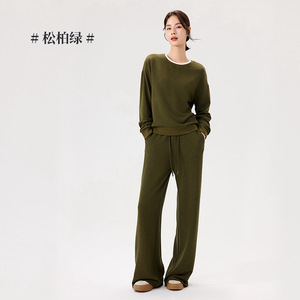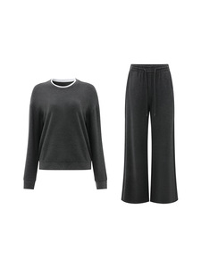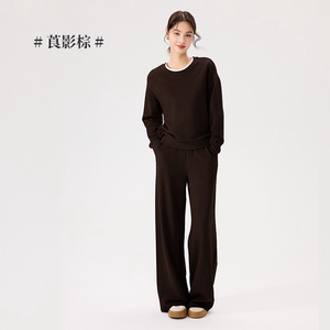 女士套装圆领上衣裤子秋冬新款长袖长裤休闲双层领拼色假两件套装
