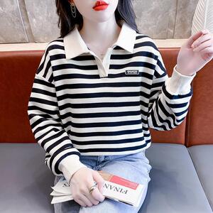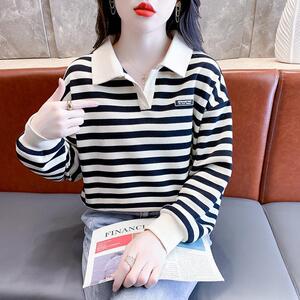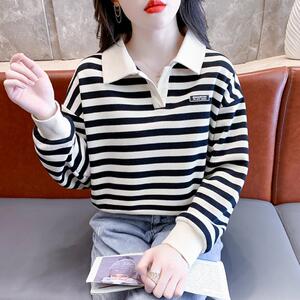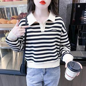 条纹polo衫纯棉不起球卫衣女春秋小个子t恤矮个子宽松ins气质上衣