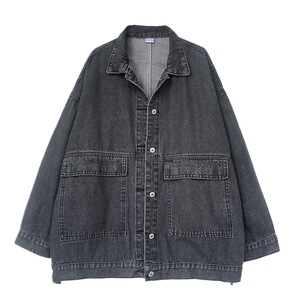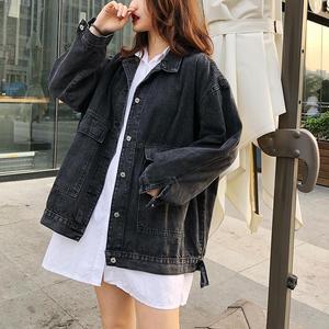 2025春秋韩版黑色工装中长款牛仔外套女宽松bf港风复古大口袋学生