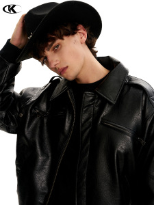 11KN美式复古黑色PU机车皮衣夹克男女短宽boxy显瘦潮翻领宽松外套
