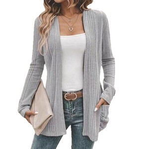 2053亚马逊欧美跨境新款坑条磨毛秋冬休闲长袖螺纹针织开衫外套女