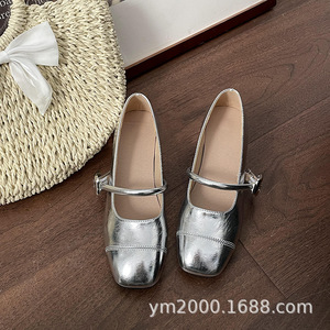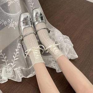 银色法式中跟玛丽珍鞋女浅口配裙子晚风温柔单鞋粗跟芭蕾jk小皮鞋