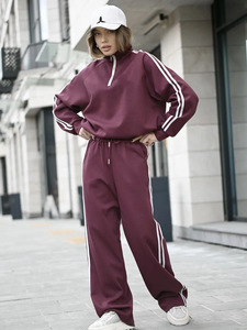 跨境休闲欧美条纹套装宽松长袖半拉链领套头卫衣系带运动裤两件套