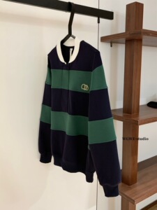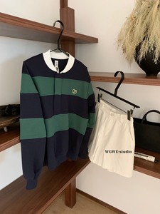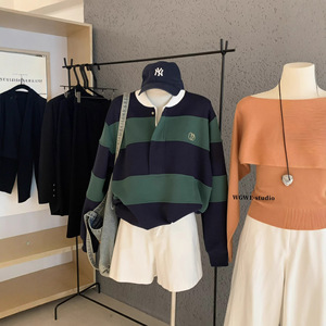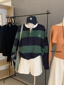 【WGWE】6897新款学院风翻领百搭条纹POLO宽松刺绣减龄休闲卫衣女