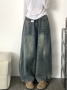 美式复古高腰直筒牛仔裤女秋季高街设计感宽松显瘦垂感阔腿拖地裤