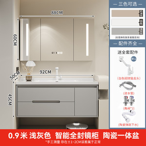 橡木门板半封智能镜柜款-银灰90cm+优等陶瓷+ 招财猫龙头出口品质
