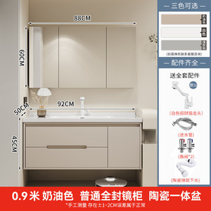 橡木门板半封普通镜柜款-奶咖90cm+优等陶瓷+ 招财猫龙头出口品质