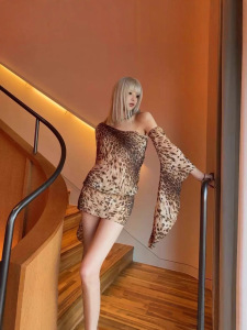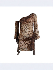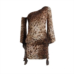 方圆同款 小众设计辣妹风豹纹斜肩荷叶边袖不规则连衣裙女