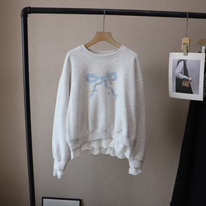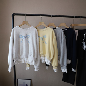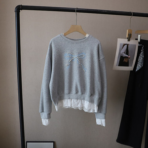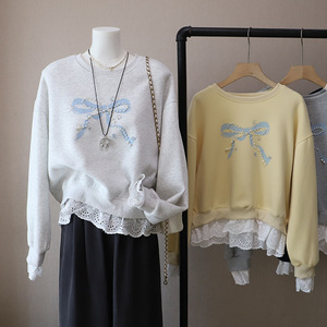 [比正]2025秋季新款韩版假两件蕾丝拼接蝴蝶结钉珠宽松卫衣女4886