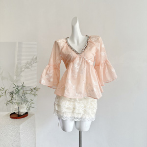 沁粉佳人~浪漫雾感刺绣钻条V领上衣+蕾丝花边半裙