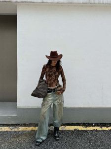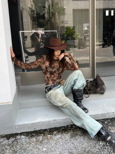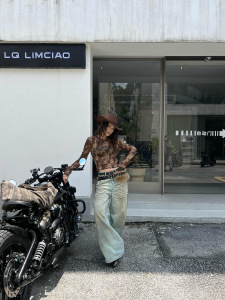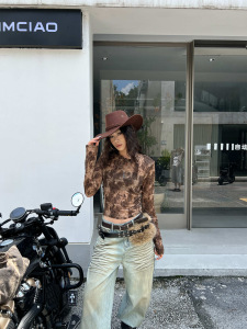2025秋季美式复古豹纹印花植绒上衣圆领修身时尚百搭长袖T恤18265