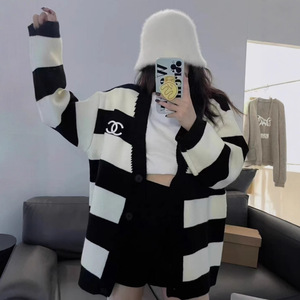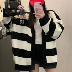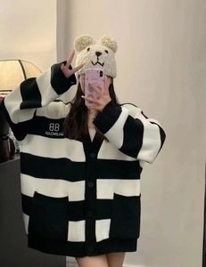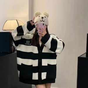 韩版毛衣外套秋冬季新款女装宽松慵懒黑白条纹针织女装开衫