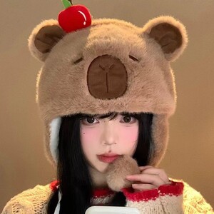 日系可爱卡皮巴拉毛绒雷锋帽子女秋冬季加厚保暖护耳帽水豚套头帽