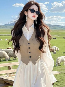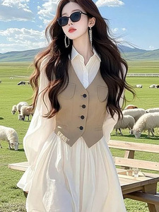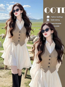 2025秋季新款法式高级感漂亮独特气质海边度假白色假两件连衣裙子