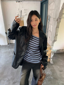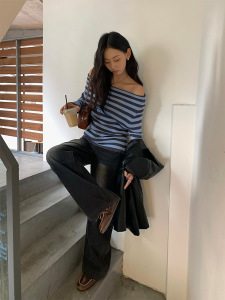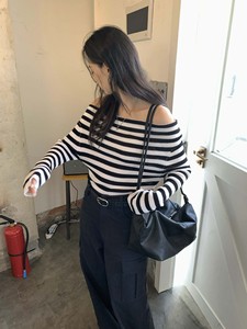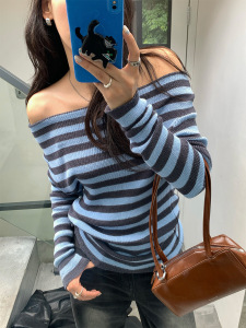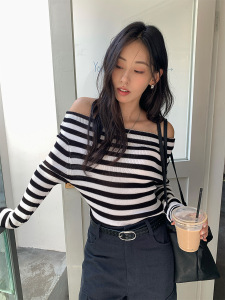 广州黄峥韩系简约气质撞色条纹一字领露肩修身针织休闲上衣530063