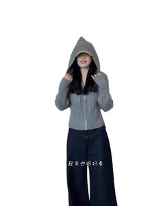 连帽针织开衫女灰色麻花拉链秋冬小个子短款毛衣外套内搭打底上衣
