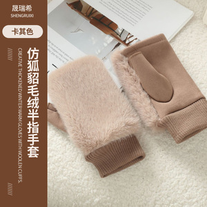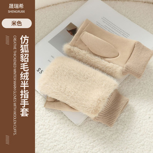 日系仿狐貂毛绒手套 批发冬季女士加厚保暖手套半指骑车时尚手套