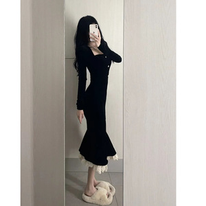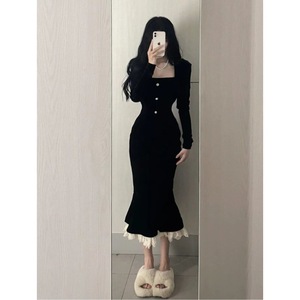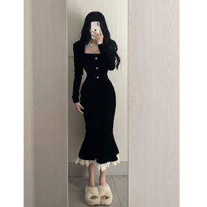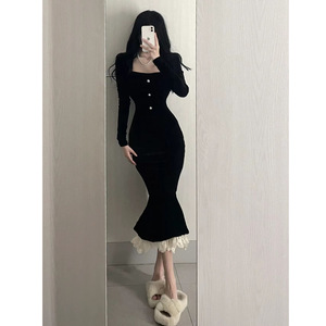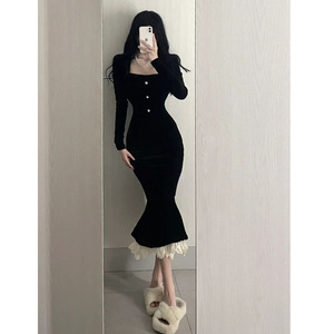 法式方领黑色鱼尾连衣裙女冬季复古温柔修身丝绒包臀裙气质长裙子