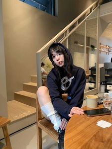 美式秋季波点字母连帽休闲卫衣学院宽松百搭藏青上衣
