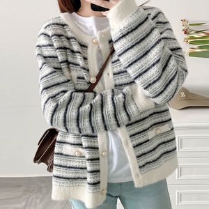 2025春秋絮色条纹针织外套宽松小香风仿水貂绒毛衣开衫小个子外套