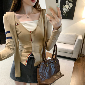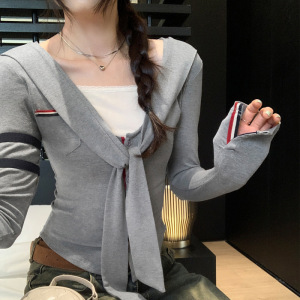 设计感披肩系带气质V领长袖T恤女秋季新款假两件修身显瘦独特上衣