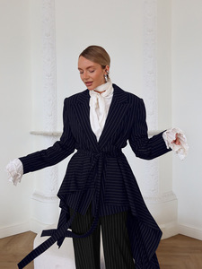 秋季欧美高级小众藏青色条纹西装上衣屁帘两件套时尚潮流西服套装