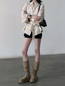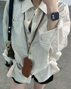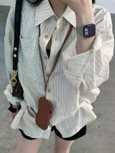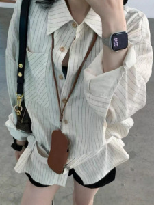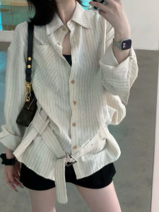 早秋韩系收腰条纹长袖衬衫女款设计感小众复古高级感chic别致上衣