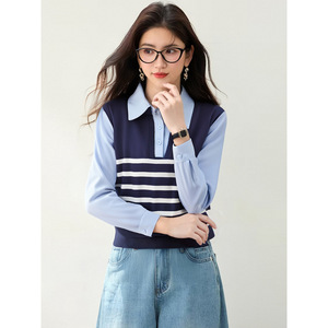 2025秋冬新款韩版通勤气质条纹针织马甲拼接翻领假两件长袖衬衫女