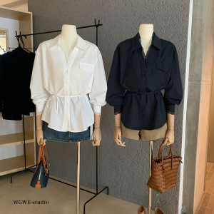 WGWE6900法式休闲蕾丝拼接V领长袖衬衫收腰显瘦上衣