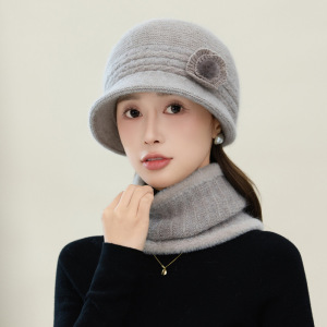 帽子女款休闲花朵针织毛线妈妈帽可围脖保暖套装中老年人户外盆帽