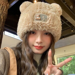秋冬季新款帽子女护耳保暖加厚毛绒可爱小熊百搭显脸小日系针织帽