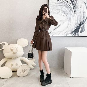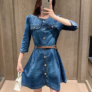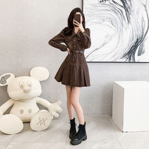 咖色复古牛仔连衣裙女秋季2025新款收腰显瘦A字长袖百褶裙短裙子