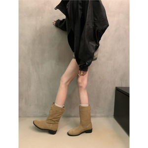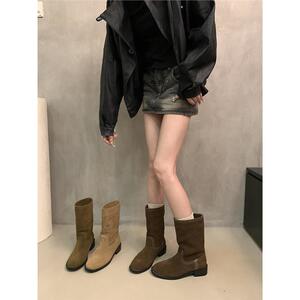 牛皮版!新款复古咖色粗跟西部靴女靴子早秋小众短筒靴马丁靴