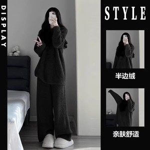 韩版冬天少女纯色睡衣女冬季新款半边绒保暖家居服加绒针织套装冬