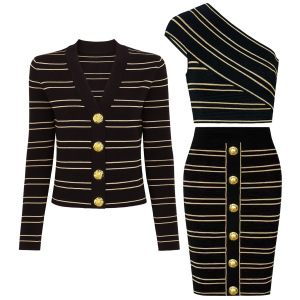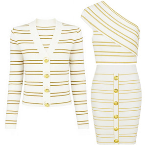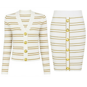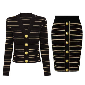 25145高品质现货欧美春秋新款时尚网红针织金丝外套 +半身裙套装