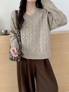 秋冬新款复古毛衣女宽松简约风麻花套头V领长袖小个子打底针织衫